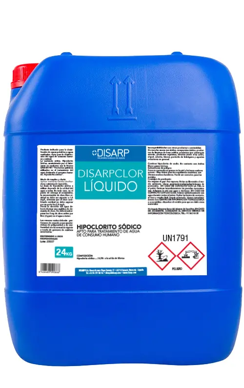 Desinfectante para agua potable basado en cloro, con una riqueza del 14,5 % de cloro activo a la salida de fábrica. eficaz desinfectante frente a bacterias, hongos y virus. Producto indicado para la desinfección de aguas potables y aguas residuales. Apto para la desinfección del agua de consumo humano y animal.
