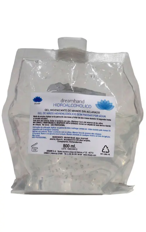 Formulado higienizante hidroalcohólico ( 70% alcohol ) en forma gel, sin perfume y de rápida evaporación, presentado en bolsas higiénicamente herméticas, lo que evita que el contenido se pueda evaporar. Su envase compactable permite reducir considerablemente el volumen de los residuos de envase generados y facilita su gestión. Especialmente recomendado para personas que necesitan garantizar una higiene máxima permanente de las manos sin la necesidad del lavado continuado de las mismas.